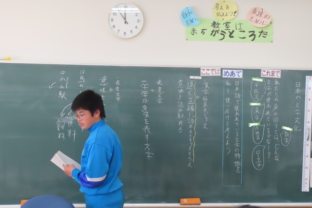 「馬のしりょうを探す」という文が示されたとき、馬の資料?飼料?悩んでしまいます。「もっと他の情報が必要だ!」と思うと同時に、「漢字で書かないと正確に意味が伝わらない」ということにも気付きました。学習する単元名は「日本の文字文化」です。「ここでは」よく使う文字の特徴や由来、日本語の表記について学習し、文章を書くときは、正しく伝わるように読みやすさを考え、表記を使い分けする必要があることを学びます。