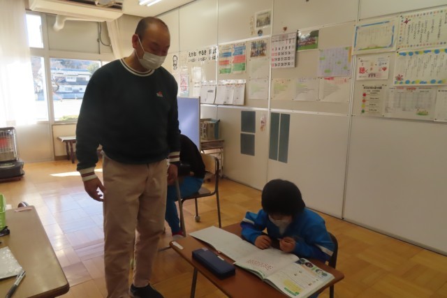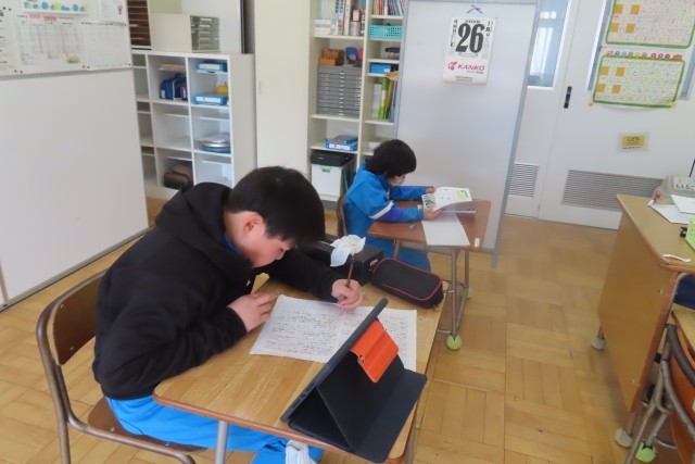6年生は国語で作文を書いていました。丁寧に読み返しながら集中力満点です。1年生は算数で「大きなかず」を学習中。教科書のたしかめ問題に挑戦し、たくさんのみかんの数を工夫して数えていました。10こずつのかたまりをつくって、バッチリ正確に数えることができました。