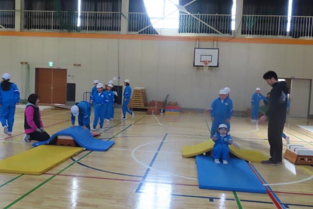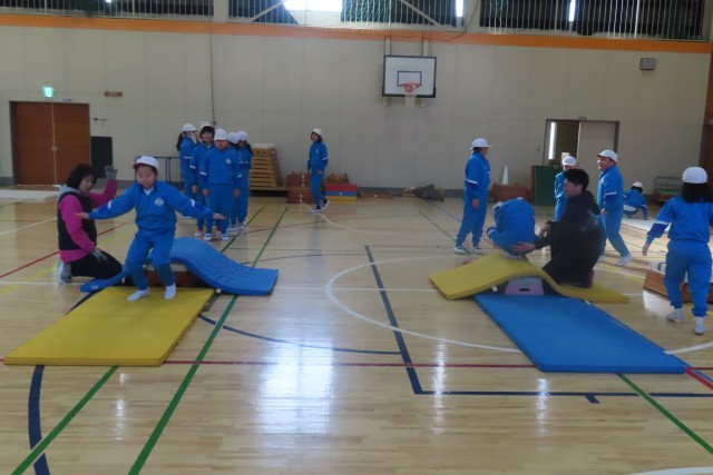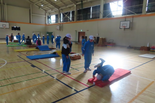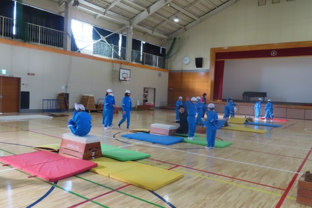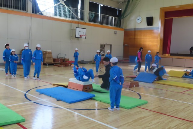 台上前転に挑戦中です。とび箱の上にマットを敷いて先生に近くで見てもらいながら試してみることから始まりました。段々と先生の手からはなれて自分一人で頑張ってみます。そしていくつか練習の場が設定されているため、高い段に挑戦する子、マットの上で前転を練習する子など様々でした。でもみんなどんどん上達します。それは自分の分析がきちんとできていたり、先生や友達のアドバイスをしっかり聴いて生かしたりしているからだと思います。