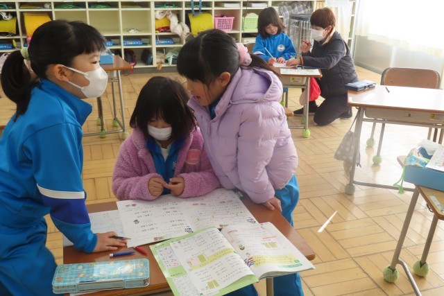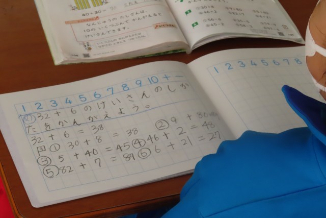 「大きなかず」の学習中です。「ここでは」「32+6」や「38-6」といった計算ができるようになっています。教室ではどんどん問題にチャレンジしていました。1のくらい、10のくらい、正しく位ごとに計算することの重要性をみんなで確認することができました。そしてお友達に上手に教えてあげたり、一緒に考えたりすることもできるようになっている1年生です。