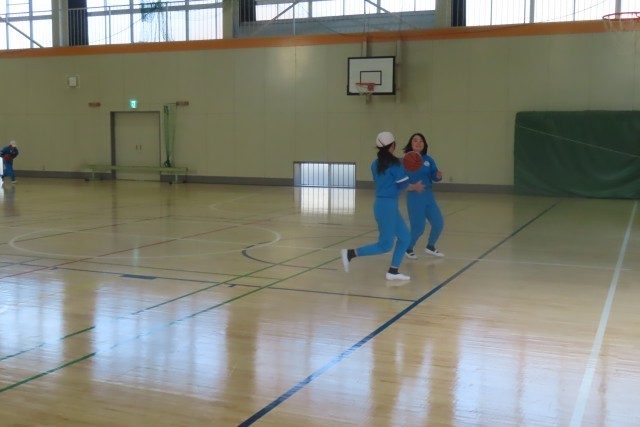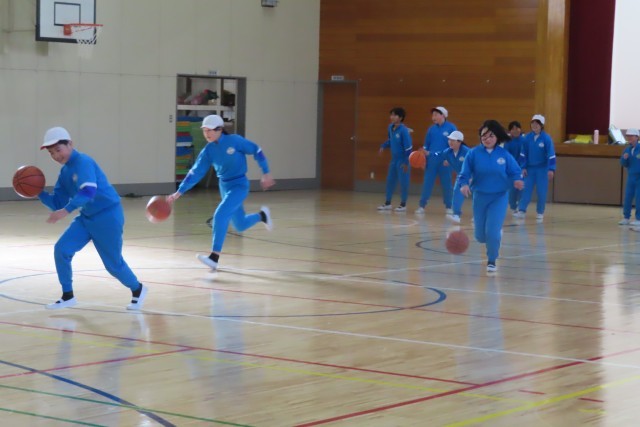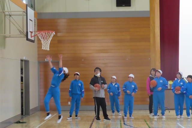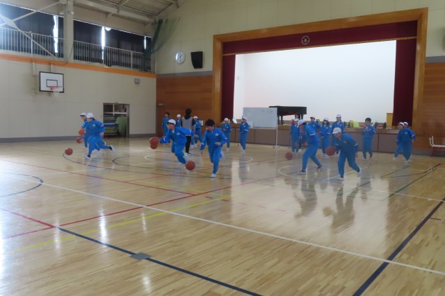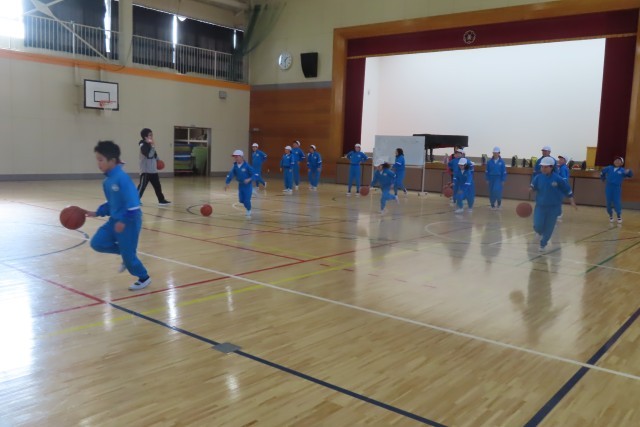 バスケットボール。ドリブルやドリブルしながらの1対1でのパス、レイアップシュートなど、たくさん動いて身に付けていました。時には友達のお手本となるプレーを見て参考にするので、目指す目標がよく分かって頑張ることができます。まだ上手にできなくても、スピード感のある動き、おもいっきりのよさを感じました。やる気も笑顔もいっぱいで、すがすがしさを感じました。