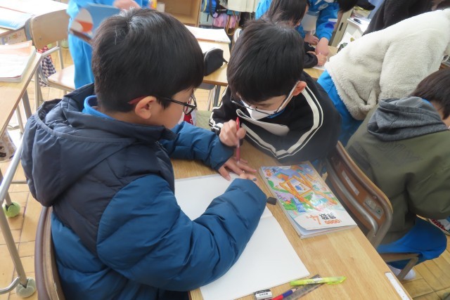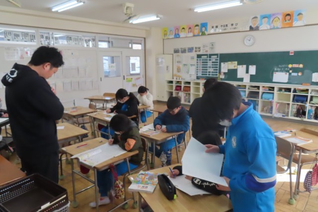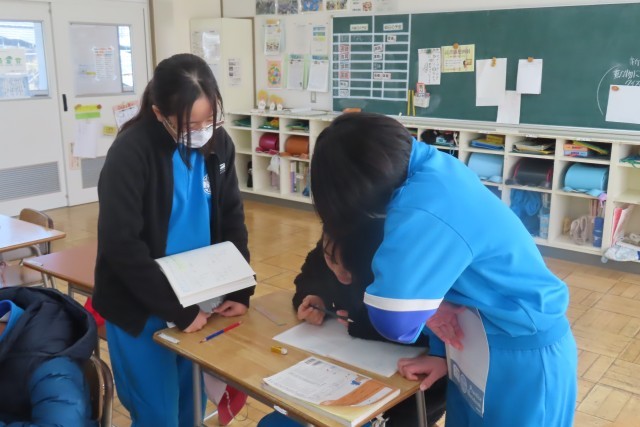 「小数と整数のわり算」。「ここでは」Ⅰの位の数がわりきれないとき、わり進みの計算、わられる数がわる数より小さいときの計算等、いろいろなタイプの計算を筆算で考えることができるようになっています。先生から出される問題にチャレンジしている時間でした。先生から○をもらった児童は、悩んでいる友達のところに行きます。上手にヒントを与えるように先生から指示があったので、答えを教えるわけではありません。友達の最小限のヒントを参考にあきらめないで考え続け、「できた!」で「笑顔いっぱい」になる4年生です。