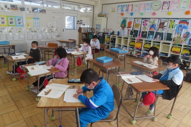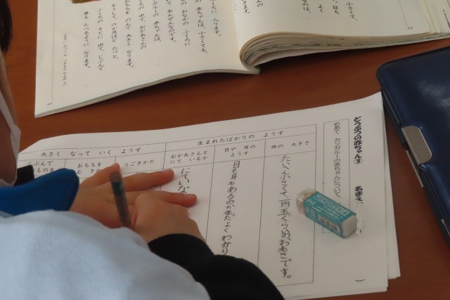 「どうぶつの赤ちゃん」の学習を通してますます知りたくなって、今度はカンガルーの赤ちゃんについての説明文を読んでいます。カンガルーの赤ちゃんは生まれたては1円玉くらいの重さしかないそうです。「ちっちゃい!」「ありさんと なかよくなれるんじゃない?」1年生なりに驚きを言葉で表していました。説明文を読んで命の尊さも感じています。