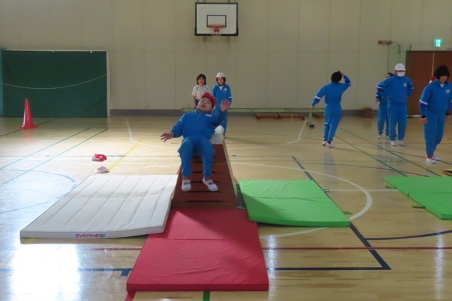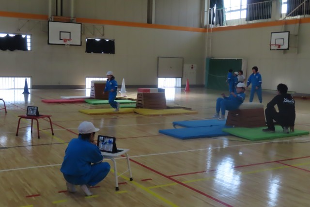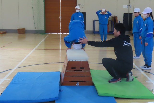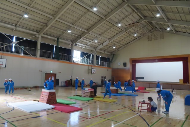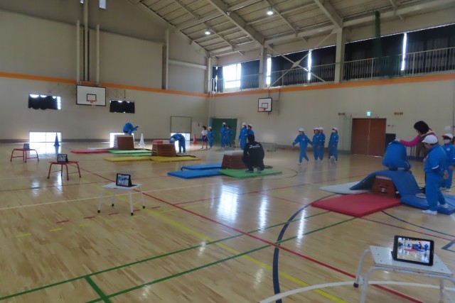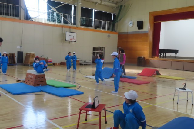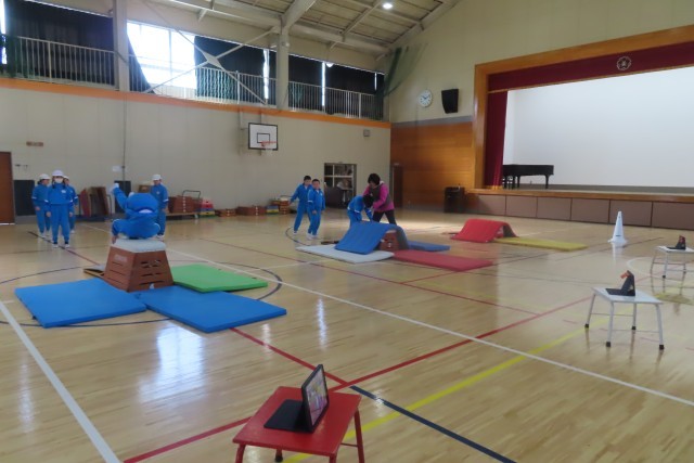 台上前転がどんどん上手になっています。体育館にはいろいろな場が設定されていて、自分で選んで練習に励んでいました。基本的なことを丁寧に身に付けたい!もっと高いとび箱で美しく演技したい!踏み切ったときの動きを集中的にマスターしたい!などなど。自分の目標の実現に向けて努力する姿。さらに友達の目指すところをよく理解してアドバイスをしてあげる姿。みんなが体も頭も、そして優しさもずっと働かせて頑張っていました。