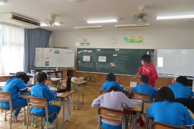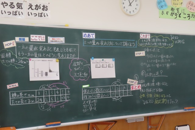 「反比例」の学習に入りました。ある場面について、一方の量が変わると、それにともなってもう一方の量がどんな変わり方をするのか?調べてみました。「これまで」学習してきた比例とは変わり方が違うことに気付き、「ここでは」「反比例」の考え方を学びます。そして来週は、xとyの関係について、比例のときと同じように式でどう表したらよいのか?グラフの特徴は?学び進めていきます。