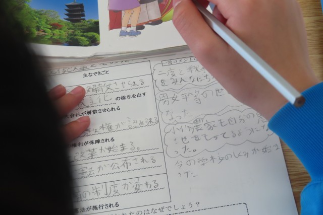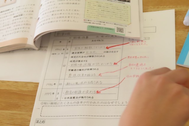 「新しい日本、平和な日本へ」の学習に入って、「ここでは」戦後の日本がどのように社会、生活を立て直し現在のように変化したのかを知り、考えます。今日は「戦後改革」について学習していました。選挙権、学校教育、日本国憲法、農地改革などなど。段々と現在に近付いてきているので、現在の社会とのつながりについても考えながら学習を進めています。6年生が持っている資料集にはこんなことが書かれています。「いつの時代も人々は世の中の課題を解決しながら、願いの実現に向けて努力してきました。・・・歴史を学んだことで、現在のわたしたちの生活が昔の人々の願いとつながっていることに気付いたことでしょう」
