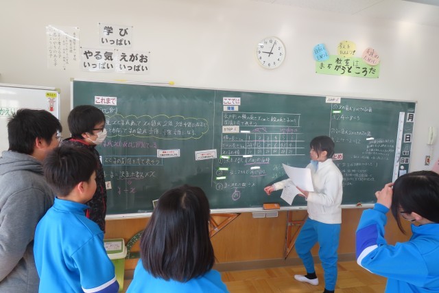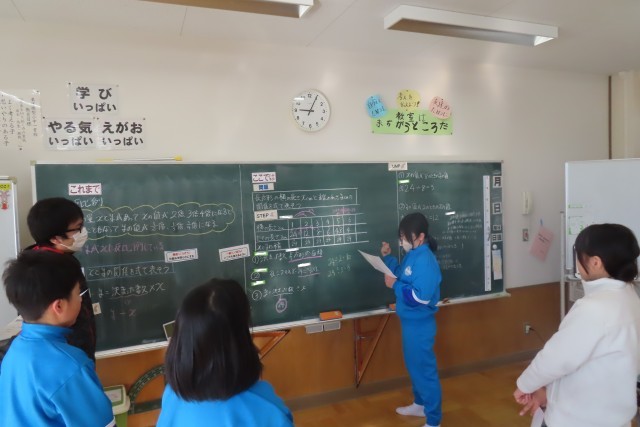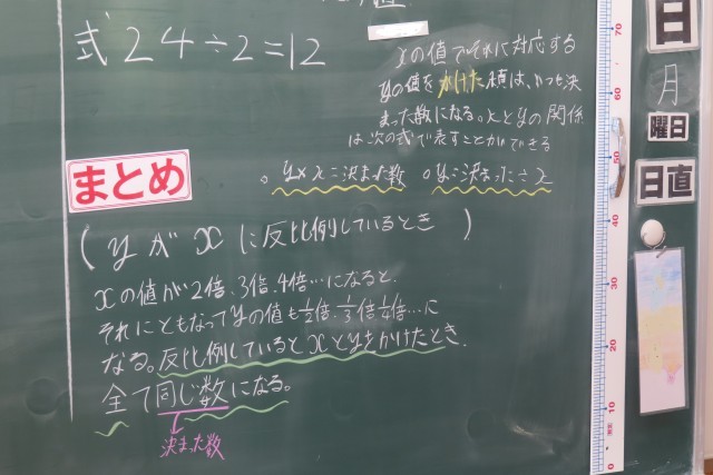 「反比例」の学習です。今日はXとyの関係を式で表したら?考えました。「これまで」比例のとき「決まった数」が大事だったから・・・今日の問題での「決まった数」は?長方形の縦と横の長さに関する2つの量の関係を表にしてみて考えました。丁寧に考えていって、式に表すことができました。友達の考えをきちんと聴いて、さらに友達の発言から思考が働きます。さっき言っていたことはどういうこと?自分は別の言い方で説明できるけど・・・等々。脳に汗をかいているのでは?と思うくらいよく考える6年生です。