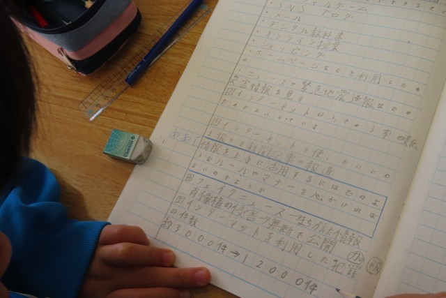 「情報を生かすわたしたち」の学習に入りました。「ここでは」情報社会と言われる現代において、私達が情報とどう関わっていけばよいかを考える大切な学習です。社会科の学習ですから、様々な資料をしっかり正しく読み解いて考えます。教室ではちょうどインターネットを利用した犯罪件数の変化に関するグラフを見て、増加傾向にあることに児童自身が危機感をもっているのが分かりました。情報モラルについて学習をしてきていることとあわせて、きちんと考えてもらいたいです。ご家庭では、お子さんが学校で日々どんな学習をしているのか、是非とも話題にして一緒に考えていただけるとありがたいです。みんなが安心して安全で幸せに暮らしていくためにも・・・。
