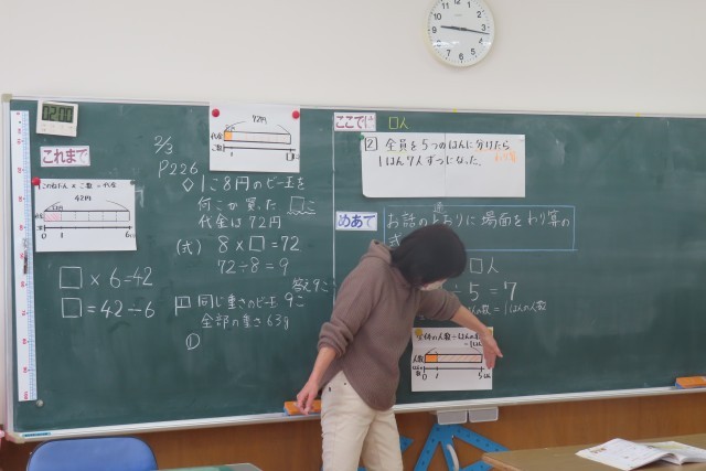 「□を使った式」今日は、お話の通りに場面をわり算の式で表して答えを出せるようになりました。何を□で表せばよいか?何算の式にする?何算で計算すればいい?段々と正しく答えることができるようになっています。丁寧に読んで、どんな場面で何を求めるのか?まずはきちんと正しく理解することがいつでも大事です。3年生はこの過程を丁寧に進めればバッチリだと思っています。