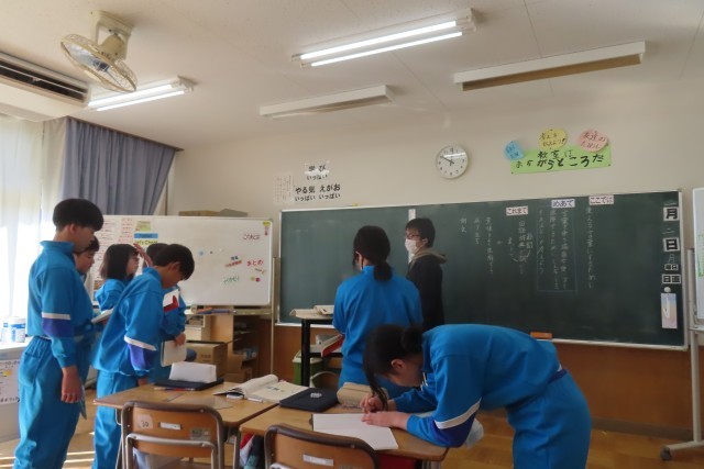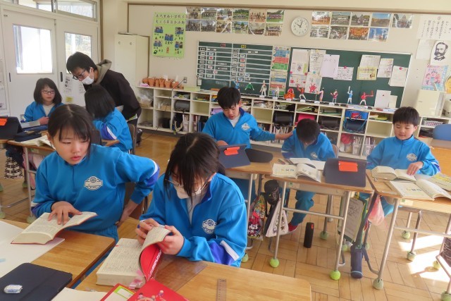 「使える言葉にするために」の学習です。「ここでは」、「これまで」小学校6年間でたくさんの言葉を学んできたことを振り返ってみて、自分自身がそれらの言葉をどうやって身に付けてきているのか?考えています。言葉の意味を調べたり、なかには「新聞を読んでいるよ」と多くの文章に触れるよう意識して生活したりする児童もいました。「国語辞典には、意味だけなくて例文をもっているので使い方を理解できる!」辞書の価値にあらためて気付いていました。