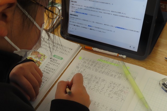 教室に入るとシーン集中して、真剣に調べ学習に向かう4年生。夢中になって知りたいことを調べています。「伝とうや文化をうけつぐ」の学習です。「ここでは」藤岡市の瓦をはじめとし、群馬県内には古くから伝わる伝統や文化を受け継いでいるまちが多くあることを学び、調べています。「これまで」国語の学習で工芸品の魅力を伝える学習をしているので、その学習ともつなげて、上手な調べ学習と発表ができることでしょう。期待しています。