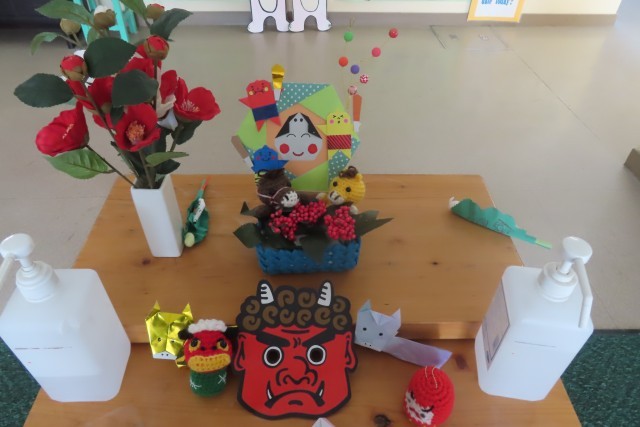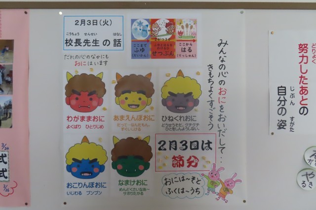 今日は「節分」今朝の朝礼で美九里西小の児童や先生たちの心の中から「おには~そと!」で退治した5つの鬼です。今日はある児童が算数の時間に、修正しなければならない間違いをそのままにしようとしたところ、「あっ、みどりおにを たいじしなくちゃ!」自分の心の中の鬼退治を頑張っていました。