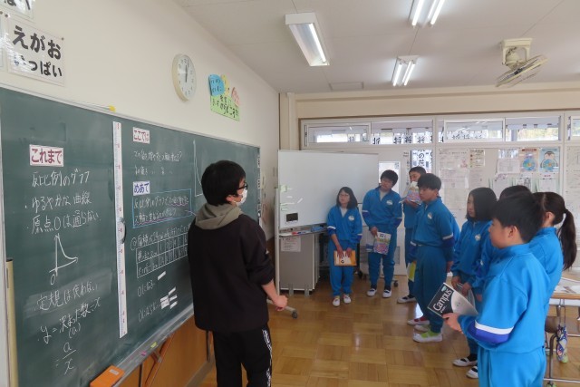 今日は「反比例のグラフ」についての学習です。ある長方形の横の長さと縦の長さの関係についてグラフにしてみたとき、xの値(横の長さ)を増やすとx軸と重なることはあるのか?という問題について考えながら、反比例のグラフの特徴について学んでいます。計算機を使って細かいところまで計算してみるなどして細かい所まで座標をとろうとしていました。いろいろやってみますが・・・、友達の説明に納得!そうだね!となっていました。