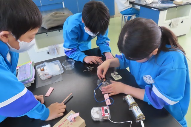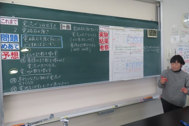 「電流がうみ出す力」今日の問いは「電磁石を強くするにはどうしたらよいか?」です。5年生で大事な「条件をととのえて」乾電池の数や導線の巻き数をその条件にして、実験をして記録をとります。回路のつくり方、簡易検流計の使い方はもうすでにバッチリです。ぞれぞれの実験で電磁石についたクリップの数を友達と協力しながら数えていました。さてどんな結果が分かって、そこからどんな考察が生まれるのでしょうか?