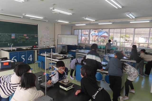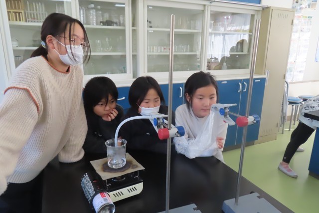 「水のすがたと温度」の学習です。今日の問いは「水を熱したときに出てくるゆげ、あわの正体は何か?」実験を通して学習です。「ゆげは白く見える。でもあわは?」「水の変化って、これまで学習したことから・・・」「見えないけどこれは・・・」「この管を通っているものは?」「火を止めてみたら、あれ?」実験しながらいろいろな気付きや疑問が生まれます。そして温度の変化と関係づけながら考えていました。