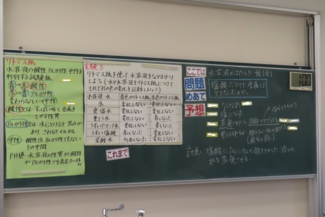 「水溶液の性質とはたらき」今日の問いは「塩酸にとけた金属はどうなったのか?」実際に塩酸にとけたアルミと鉄について、液体を蒸発させてみて何が残るのかを実験を通して調べています。特に安全面で最大の注意をはらって実験しました。予想の段階では様々な考えが出されました。何かしら出てくると思うけれど、成分は同じなのか?そうでないのか?細かい所まで予想したので、実験を見る目、そこで働く頭もしっかりと働かせていました。