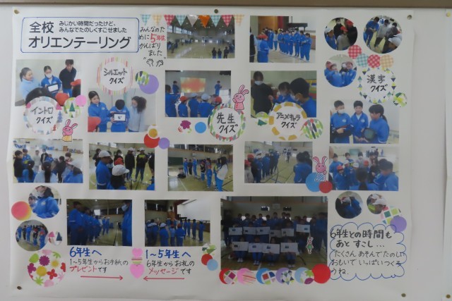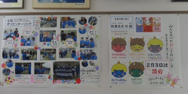 児童が大好きな西うさぴょん掲示板(教務主任協力)がリニューアルされました。今週は節分で5つの鬼を退治しました。まだ鬼の顔にはみんながまいた豆がくっついています。さて、その隣に今日の全校オリエンテーリングでの児童の「笑顔いっぱい」な写真で飾られた掲示物が登場しました。西うさぴょんもみんなと一緒に喜んでいます!月曜日の登校を楽しみに!