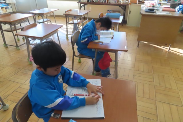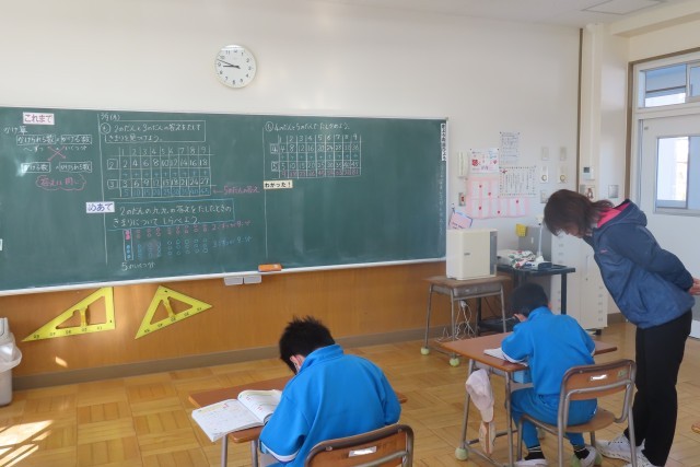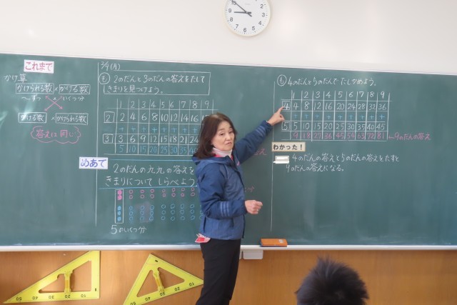 本年度2年生が特に頑張った「かけ算」について「ここでは」そのきまりを考えます。かける数が1ふえると、答えはかけられる数だけふえる!かけられる数とかける数をいれかえても答えは同じになる!さあ、今日も「かけ算っておもしろい!」と思えるようなきまりを発見しました。2つのだんの九九の答えをたしてみると???「わかった!」で「学びいっぱい」な2年生です。