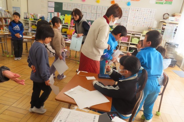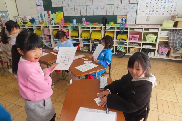 英語でいろいろな野菜のカードをやり取りしていました。英語版のお店やさんごっこ!ついさきほど1年生は日本語でやりましたね。英語での言い方と日本語での言い方との違いを知り、英語での言い方を楽しんでいました。そしてHere you are. Thank you! あたたかい英語でのやり取りも上手にできました!