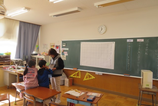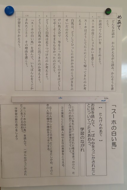 「スーホの白い馬」の学習に入ったばかりです。今日はこのお話の展開を表にまとめてどんな出来事かを確かめ始めました。読み始めてみると「馬頭琴」という楽器が出てきました。教科書にその説明が書いてあるのでなんとなく分かりましたが、先生が実際の写真を見せてくれました。「ここでは」人物の様子が分かる言葉を見付けて場面を思い浮かべながら読み、心動かされたところを友達と伝え合うようです。あわせて、いろいろな国や土地に伝わるお話を読んでみたい!と思えるようになってほしいです。