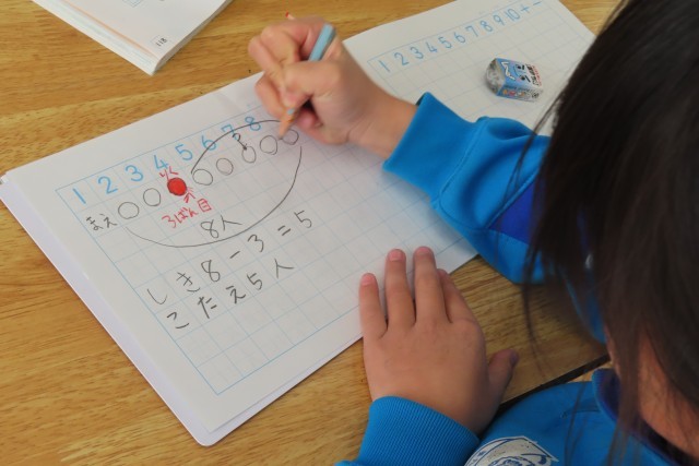 「ずをつかってかんがえよう」の学習に入りました。「ここでは」文章題を読んで、図を使って考えてみると式や答えを導きやすくなることを学びます。図で表してみると答えが分かるけれど・・・でも、たしざん?ひきざん?どうやって考えたのか?式にすると?たしざんやひきざんのキーワードがないけど?一生懸命考えていた1年生でした。