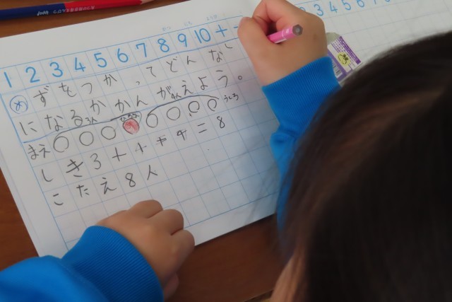「ずを つかって かんがえよう」の学習です。今日の問題は、前時までとは違います。でもよく問題を読んで、その場面を図に表してみれば「できた!」につながります。「このあとは」たくさんの算数の学習の中で、「ここでは」身に付けたように図で使ってみる考え方が大切になることがたくさんあります。
