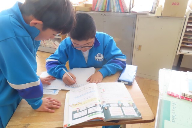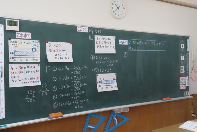 「2けたの数をかける計算」今日は「1こ12円のおかしを23こ買ったときにの代金」を工夫して求めることができるようになりました。3年生は「これまで」学習してきたこととつなげて考えればできる!とよく分かっていました。「ここでは」2けたの数をかけるとき、「これまで」学習したかけ算が使えるように、かける数を位ごとに分けて考えればよいことを学習し、筆算で計算できるようにもなります。自分の力で考えるのはちょっと難しい・・・友達同士でも考えました。