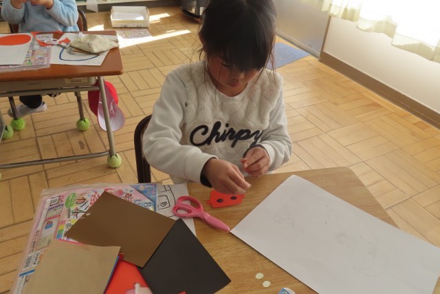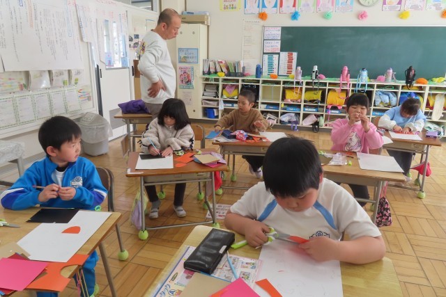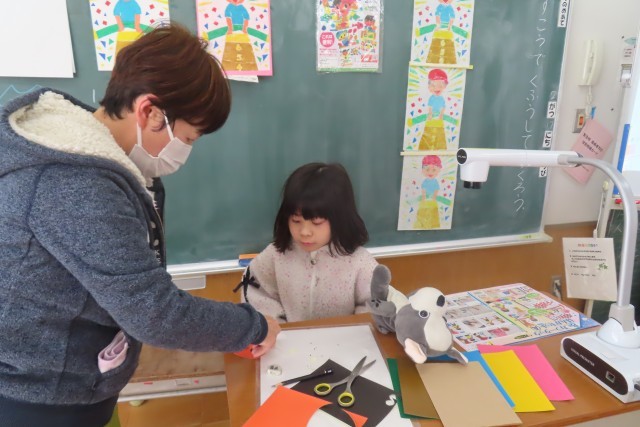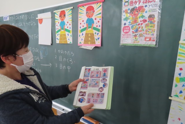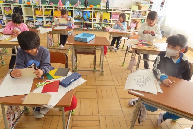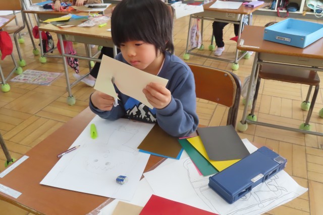 色カラー版画を楽しく学習中です。今日は台紙の上の下書きに色タックバンを貼り付けていました。彫刻刀を使わない色版画です。表現したいものはあります。でもそれがどんなかんじの作品になるのか?イメージをふくらませて工夫するために、先生が過去の1年生の作品や先生の作品を見せてくれました。「こんなかんじになるんだな」「こうすればいいな」自分の想像が広がって、工夫を思いつきます。
