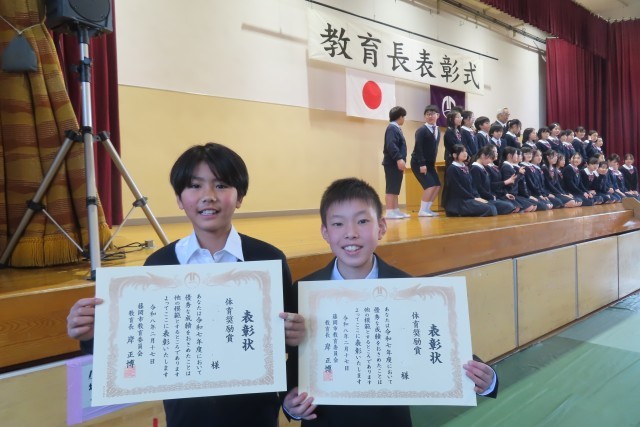 本日、市総合学習センター体育館にて、標記の式が挙行されました。本校より2名の児童がバレーボール(藤岡EAST)における活躍として、「体育奨励賞」を受賞し、教育長より表彰していただきました。本年度は259名の受賞者が表彰された中で、2人の返事はピカイチ!でした。自分が頑張ったこと、チームの仲間とともに頑張ったことに誇りをもって、こうやって堂々と返事のできる2人はすごい!と感心するとともに、ますます応援したい気持ちになりました。本当におめでとう!