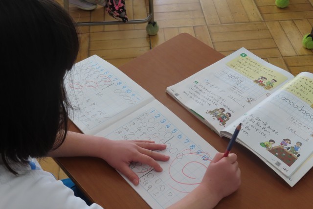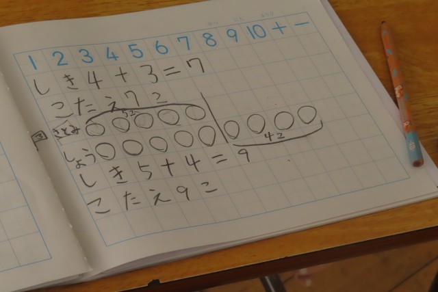 「ずを つかって かんがえよう」場面を図に表して式に表して考えることが大得意!になった1年生。「できた!」先生からノートに大きな花丸をかいていいよ!の許可をもらって喜んだり、「せんせいもんだい」を出されて「やった!」と大喜びしたりしていました。「もう、ブロックやおはじきを つかわなくても できるもん!」と自信たっぷりで「やる気いっぱい」な1年生です。