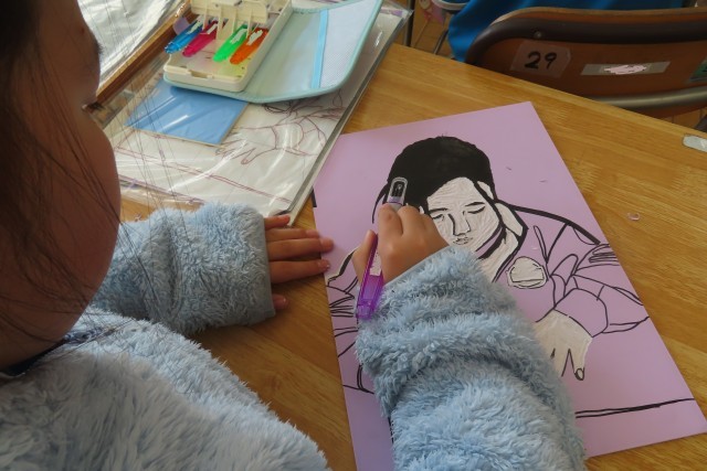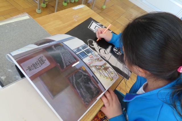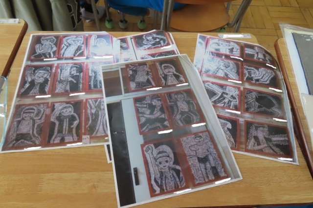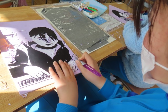「5年生でいちばん輝いていた自分の姿」を木版画で表現します。それぞれの作品をよく見ていると、木の板から飛び出してきそうなくらい気持ちのこもった動きがよく伝わってきます。一生けんめい頑張ったこと、これからも頑張りたいこともよく伝わってきます。いちばん輝く自分を表現するための工夫として、過去の児童の作品(4・5枚目の写真)を参考にしていました。