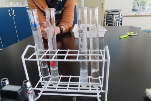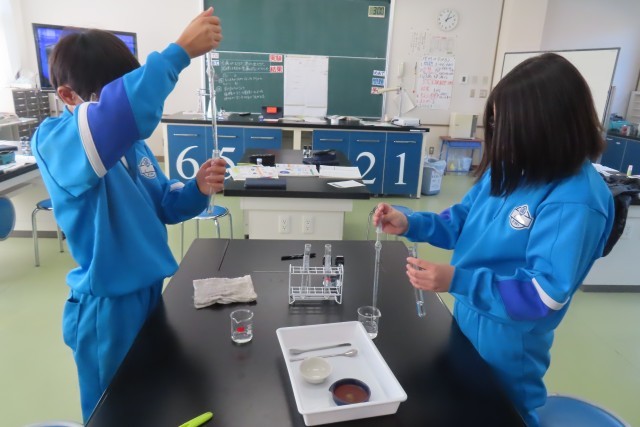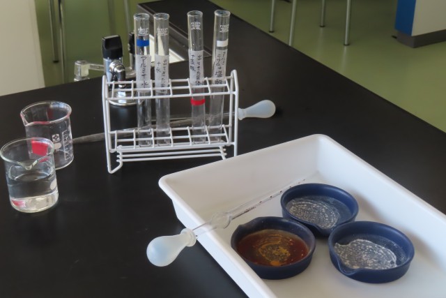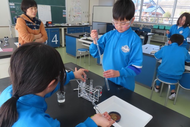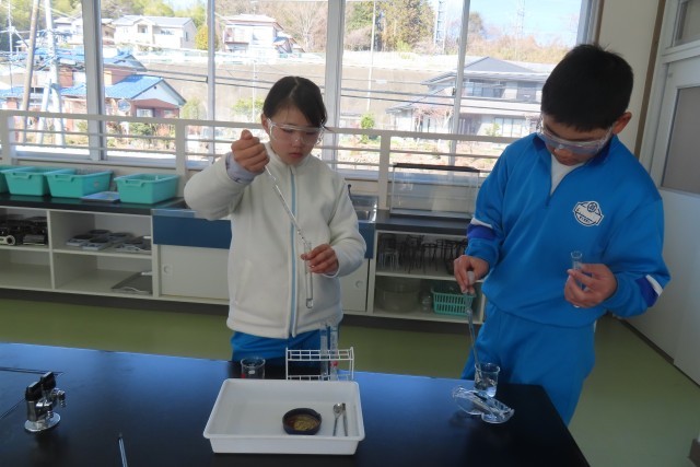 「水溶液の性質とはたらき」「ここでは」一つ一つの実験につながりがあって、今日は先日実験して得られた固体を使いました。今日の実験は、金属がとけた液から出てきた固体はもとの金属と同じなのか?実験を通して調べていました。大切なことはそのために、何を使ってどんな実験をするのか?何に注目すればいいのか?もちろん安全面等で気を付けなければならないことを注意して十分に準備をする必要があります。友達とよく協力してきちんと進めることができました。
