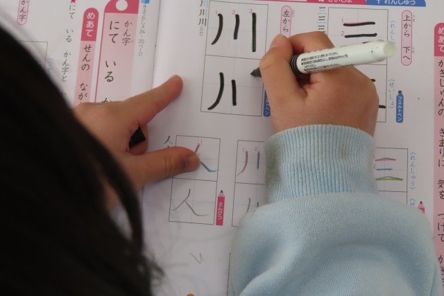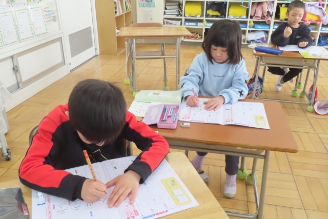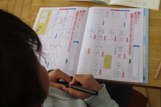 書き順に気をつけて、よい姿勢で丁寧に書いていました。今日はフェルトペンを使て書くことにも挑戦していました。「なんだか こわいなあ」といいながらも挑戦です!消しゴムで消すことができないので、いっきに集中度が増しました。丁寧に字を書くことができる子になってほしいです。