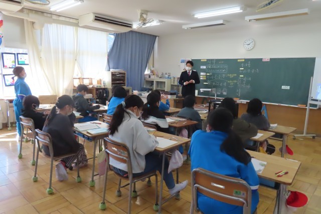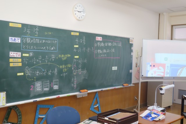 「分数」の計算についての学習が広がっています。今日は帯分数のひき算で、分数部分がひけないときはどうしたらいいか?考えていました。教室ではちょうど「まとめ」をしているところでした。帯分数を仮分数に変身させて計算すること、整数部分を分数になおして計算すること。この2つにまとまりました。この2つは「○○さんや□□さんの発言」から広がってみんなで一緒に考えたものでもあったようです。だから「学びいっぱい」になり、ふりかえり問題を頑張ることができました。