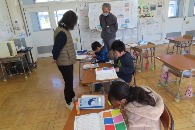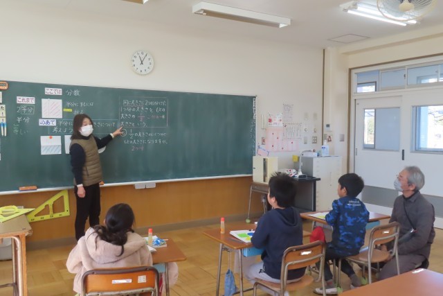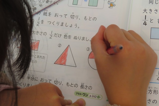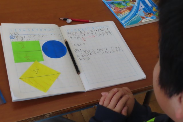 「分数」の学習に入りました。「これまで」半分とか2等分と言っていたのが、今日は「二分の一」と言い、正しく書くことができるようになりました。そして「分数」という算数の新しい言葉とも出会いました。分数で大切なのは「同じ大きさに分けたもの」です。何度も確認しながら、「二分の一」の部分に色を塗ったり、好きな色の色紙を選んで「二分の一」の大きさに切ったりしていました。