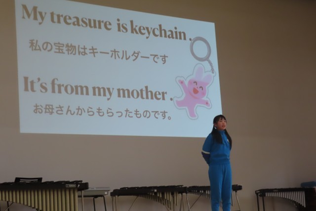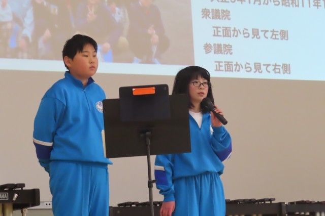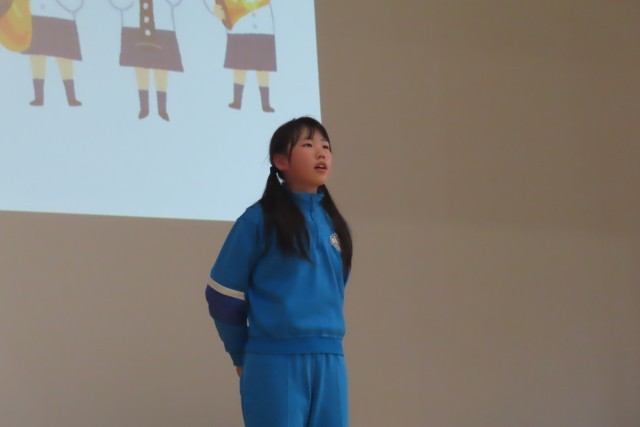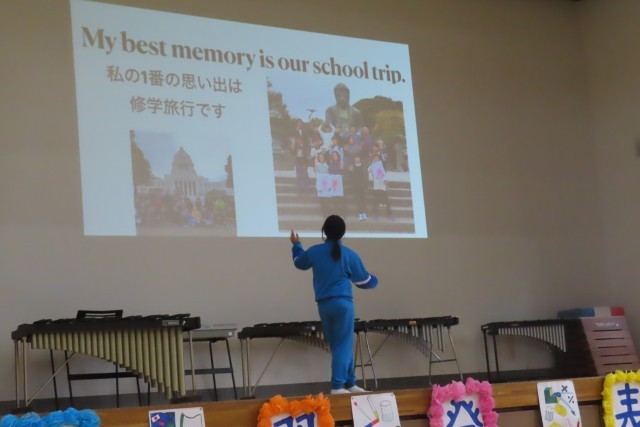 修学旅行での学び、思い出をスライドで発表しました。続いて英語で頑張ったスピーチ「My treasure(私の宝物)」「My Dream(私の夢)」「My Best Memory(小学校生活一番の思い出)」を堂々と語りました。学習が広がり、深まり、見る世界、踏み出す世界がさらに広くなって、中学1年生に向かって準備万端!を感じられるような素晴らしい発表でした。