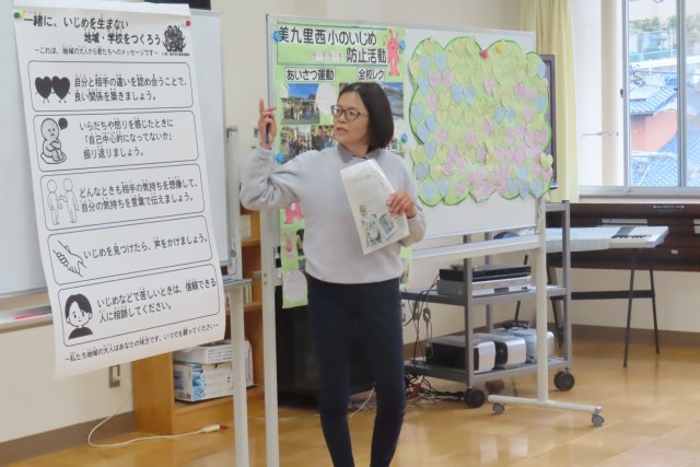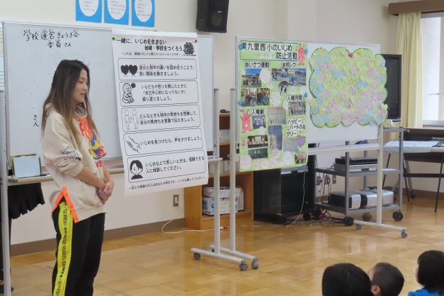 続いて、子供たちの最強応援団である学校運営協議会の3名の委員さんが、子供たちを見守る地域の大人を代表してメッセージをおくってくださいました。これは「いじめ問題解決に向けた教育懇談会」(大人たちの会議)で話し合われた多くのメッセージが集約されたものです。3名の委員さんの語る温かいメッセージがしっかりと子供たちの心に届きました。地域の大人はみんなのことを宝物!大事に思っているんだよ。誰かが必ずそばにいてくれるんだよ。相手の気持ちも大切にして!自分の気持ちを素直に自分の言葉で伝えてね!「あいさつはいじめをなくす魔法の言葉」だよ!こんなふうに優しく真剣に子供たちのことを思ってくださることに感謝の気持ちでいっぱいです。いつもありがとうございます。