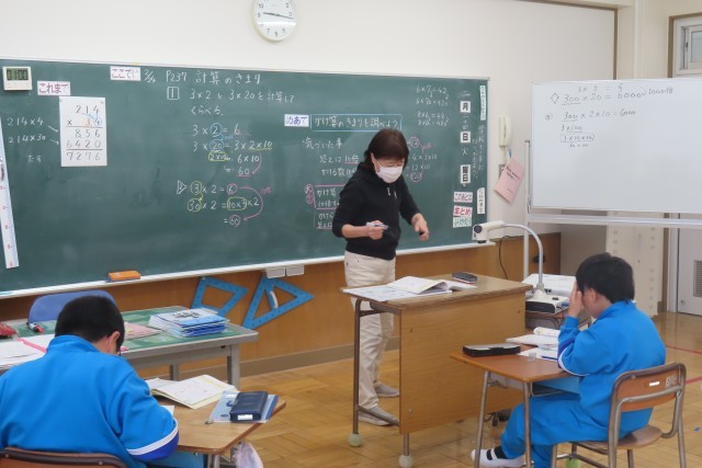「2けたの数をかける計算」です。「ここでは」2けた×2けた、3けた×2けたのかけ算ができるようになり、そして今日はかけ算の計算では、かける数を10倍すると答えも10倍になることが分かりました。数がどんどん大きくなっても、こうして「かけ算のきまり」が分かってくると「やる気いっぱい」になるものです。そろそろ計算の順序など、工夫して考えることができるようになってくるのではないでしょうか。3年生!できる!