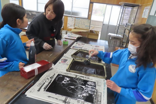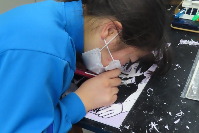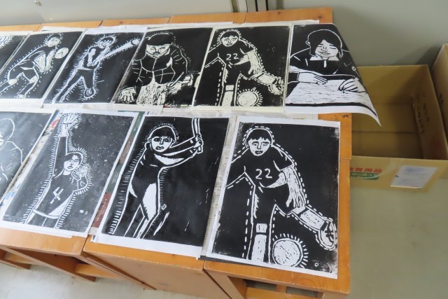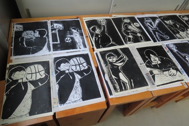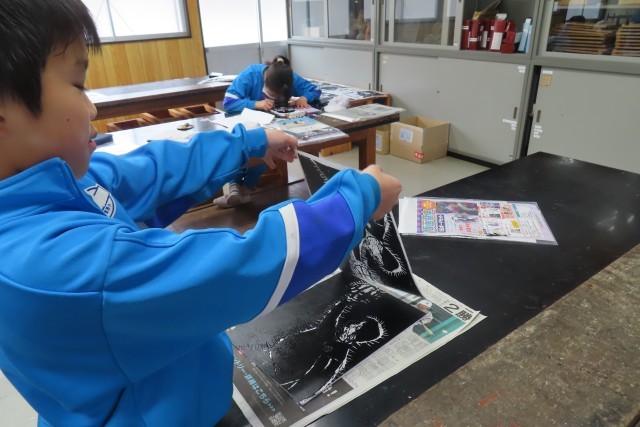 「5年生でいちばん輝いていた自分の姿」を木版画で表現し、段々と作品が出来上がってきました。一枚一枚の紙に思いを込めてインクのついたローラーを転がして、バレンでこすって、紙をめくっています。自分の表現したいような動き、表情が生き生きと生まれ出るように彫刻刀を上手に使うことができるので、きっと自分自身で満足いく仕上がりになったのではないでしょうか。