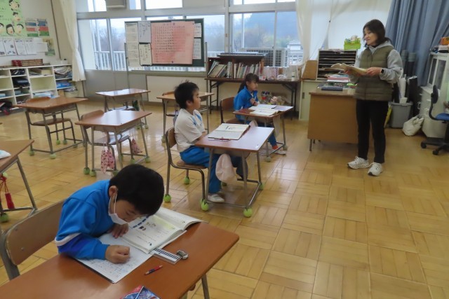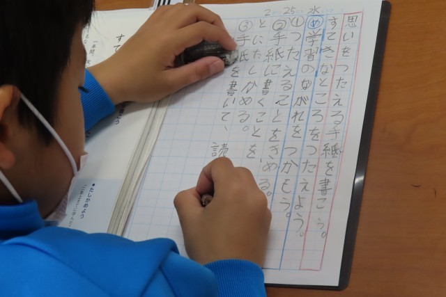 今日から新しい学習「すてきなところをつたえよう」に入り、教室では「ここでは」どんなことを学習するのか?学習計画をたてていました。「ここでは」1年間一緒に過ごした友達の「すてきなところ」を手紙を通して伝えます。自分の思いを手紙にして、受け取る友達のことを考えながら大事に書きます。もちろん受け取った手紙の返事も書きます。とってもすてきな学習ですね!そういえば、昨日の道徳の授業では、たしか友達のよいところについて考えていたような・・・。3人の2年生がお互いに手紙の交換を通してもっともっと仲良しになれるといいですね!