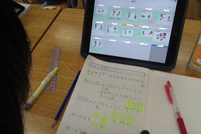 今日から「直方体と立方体」の学習に入りました。今日は、いろいろな形の箱を仲間分けしてみました。その理由は?どこに目をつけて仲間分けしたのか?が大事です。「ここでは」面の形に着目して見て、「立体」(直方体、立方体)という形の見方ができるようになります。さらにそれぞれの特徴を調べ、展開図もかけるようになります。そういえば5年生も立体のことを学んでいる最中です。