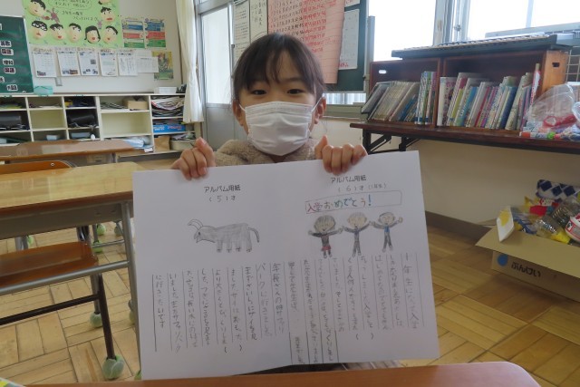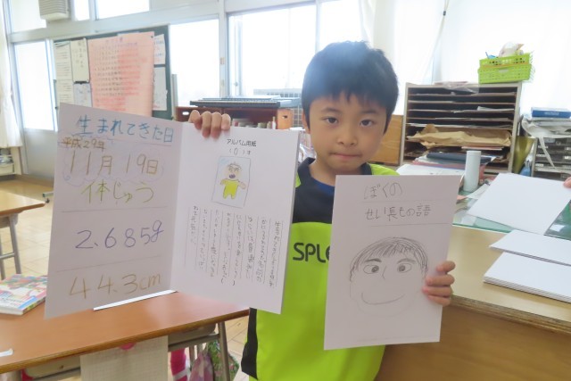 「明日へつなぐ自分たんけん」生まれてから今日までの自分を一枚の手作りアルバムにまとめて、もうすぐ完成です。家族にインタビューするなどしてまとめてきたことを嬉しそうに見せてくれました。家族の愛情をたっぷりもらってここまで大きくなった自分のこと、ますます大好きになっている2年生です。そしてこんなにもたくさんできるようになったことがある!まさに明日の自分につながる自信をたくわえています。