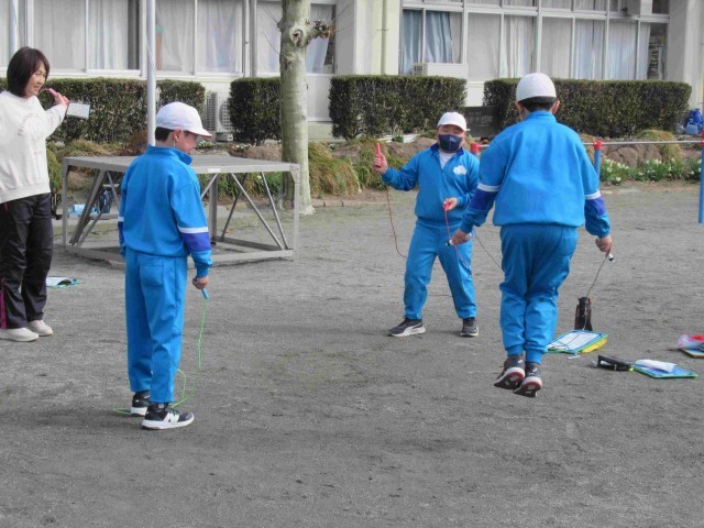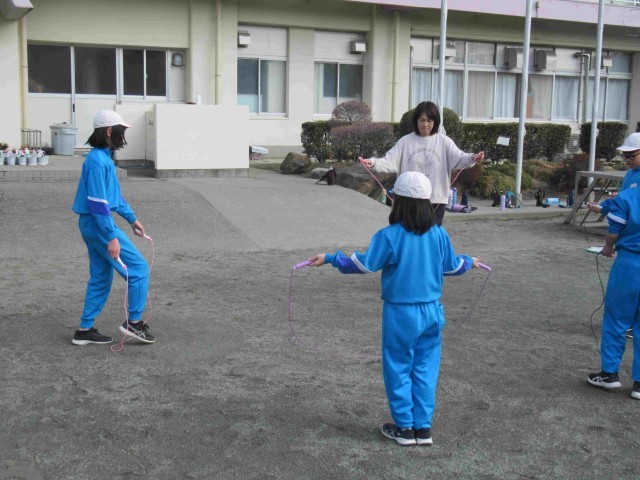雨上がりの爽やかな空気の中、3・4年生は縄跳びを行っていました。「なわとびカード」を見ながら、技や回数を決めて挑戦しています。4年生が優しく3年生に教える場面や、教師がすごい技を見せると、「教えてください!」と自分から聞きに行ったりする姿などがたくさん見られました。