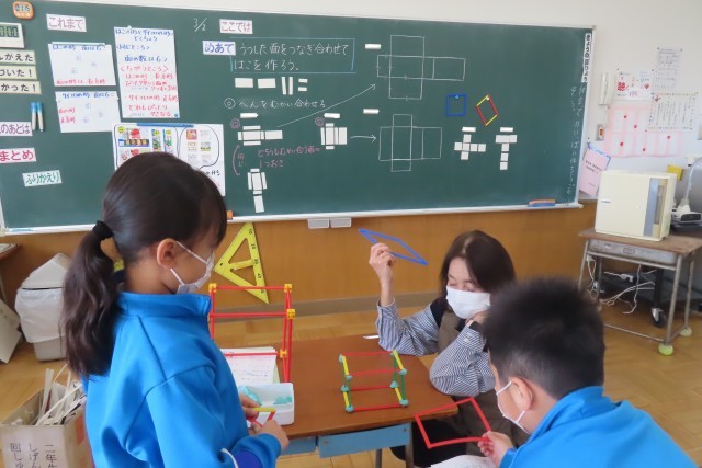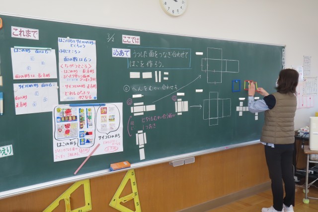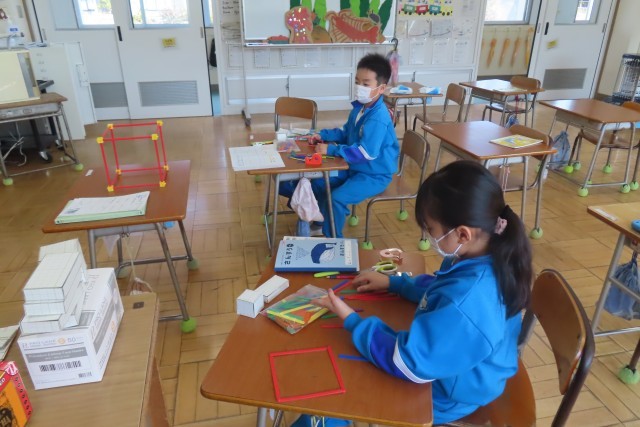 「はこの形」の学習です。今日はうつした面をつなぎ合わせて箱を作っていました。「ここでは」さいころや箱の形について、面、辺、頂点などの点に着目して、その特徴を考えることができるようになります。実際に作ってみる活動に悪戦苦闘していましたが、その都度落ち着いて先生と一緒に確認していました。面はいくつ?頂点はいくつ?辺の数は?こうやって学習を進めていきながら、立体図形の見方を段々と身に付けていくのですね。