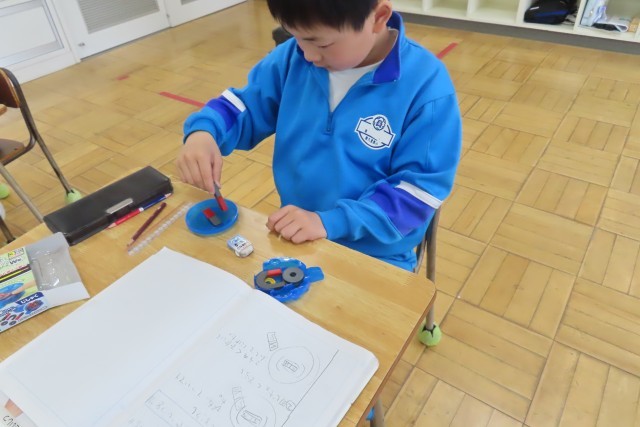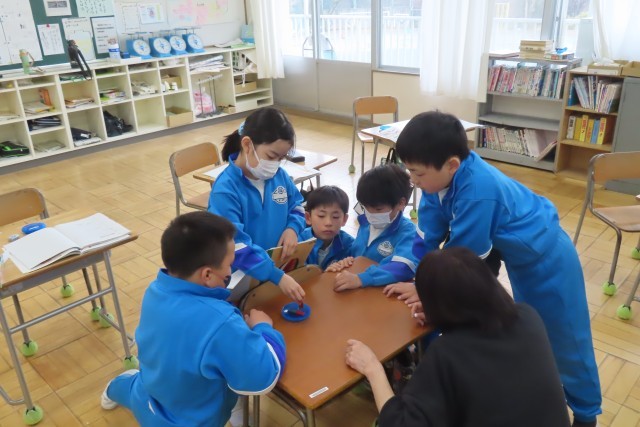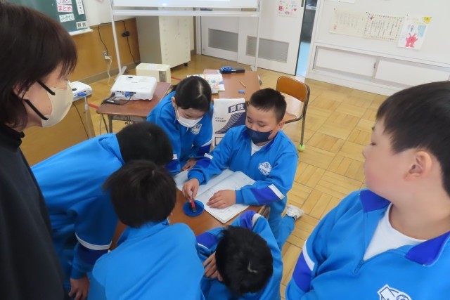 「じしゃくのせいしつ」今日は極の性質について実験して発見!磁石の極同士の組み合わせを変えて、近付けたときの様子を見てノートにまとめます。絵をつかったり、文章にしたりしてそれぞれの表現の仕方が見られました。次は実験の結果、つまり自分がノートに表現したことをみんなに分かりやすく説明します。友達の説明の仕方をよく聴いて、自分と同じ!えっ?それはどういうこと?やり取りしながら今日の問いを解決していました。