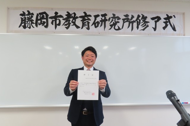 本年度一年間、藤岡市教育研究所研究員としてよりよい授業作りを目指して研鑽を積んだ職員がいます。とても素晴らしい成果をあげ、この日教育長より修了証をいただきました。子供たちが目を輝かせて学ぶ姿をもっともっと見たい!と研究に励みました。児童はもちろんですが、職員も「学びいっぱい・笑顔いっぱい・やる気いっぱい」で頑張っています。