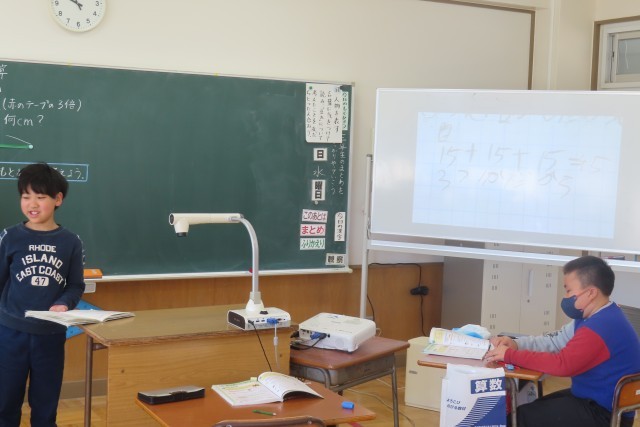 今日から「倍とかけ算、わり算」の学習に入りました。「赤いテープ15cm、緑のテープは赤の3倍。緑のテープの長さは?」何倍かした大きさの求め方を考えました。全員がきちんと自分の考えをもつことができました。「ここでは」何倍?何倍かした大きさは?を考えるとき、「もとにする大きさ」が大事であることを学びます。そしてかけ算を使うのか?わり算を使うのか?を正しく判断して考えることができるようになります。