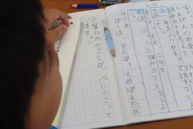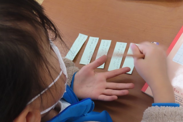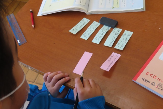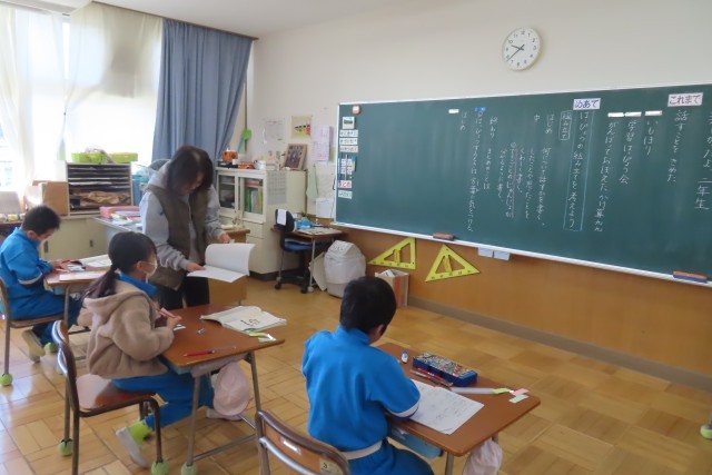 「楽しかったよ、二年生」の学習に入りました。「ここでは」発表の組み立てを考えることを学習します。テーマは2年生としてのこの1年間を振り返って特に思い出に残っていることについてです。かけ算九九をがんばったこと、いもほりのこと、学習発表会のこと。3人それぞれが自分の心の中に強く残っている思い出を文章に表現します。2年生なりに分かりやすく伝えるにはどうしたらいいか?「これまで」の学習をフル活用して頑張ります!