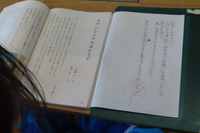 「スワンレイクのほとりで」の学習に入りました。ちょうど教室では現在の「歌」の気持ち、原稿用紙に作文を書き始めて手が止まってしまったときの「歌」の気持ちを想像しているところでした。「ここでは」登場人物が経験したことや他の人物との交流によって移り変わっていく気持ちを想像しながら物語を読み進めていきます。そして「こんな読み方をすると楽しい!」物語を読むことに対する新しい見方に出会うことも期待されます。