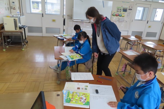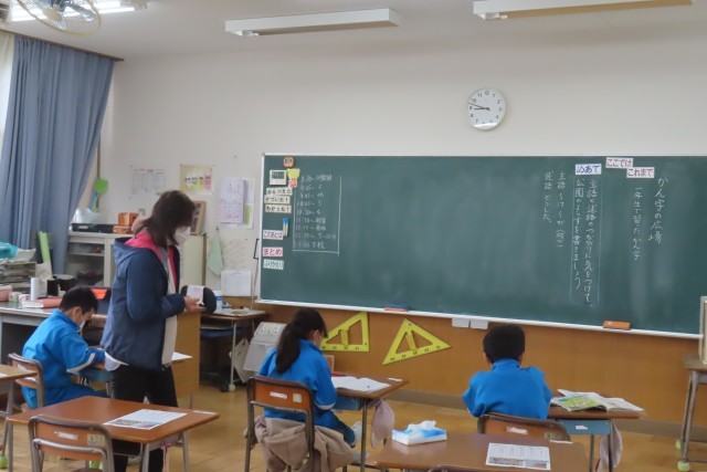 「おじいさんが休みながらお茶を飲んでいる」教科書の公園の絵を見て、文章を作って発表しあっていました。「これまで」学習してきたことをきちんと使うこと(漢字、主語と述語のつながりなど)をしっかりと意識しながらノートにたくさんの文章を書くことができました。自分が気付かなかった友達の文章からも学ぶことがありました。